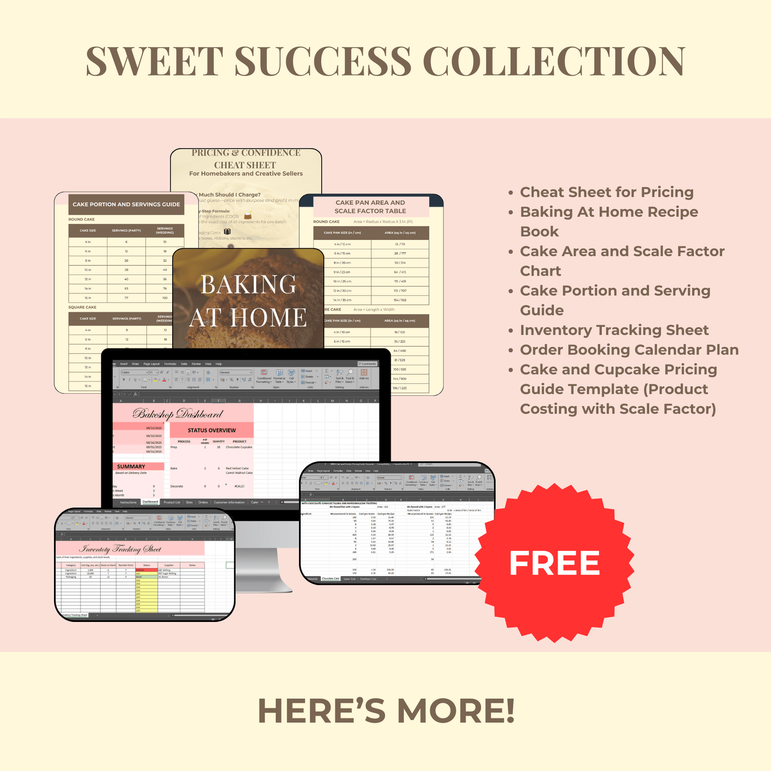Your all-in-one baking toolkit! From beginner guides to business templates, pricing cheat sheets, and order planners—Sweet Success Collection gives you everything you need to bake, organize, and grow your home bakery with confidence.